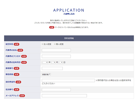 「入会申し込み」ページからお手続き下さい。まずはじめに「療養費の請求代行及び療養費の取扱いに関する利用規約」の内容をご確認いただき同意の上、「入会申し込み」にお進みください。 入会審査、入金手続き、キー・書類発送などの手順を順次ご案内いたします。