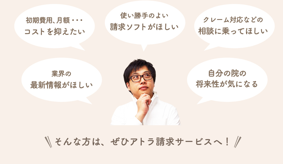 アトラ請求サービスは、「療養費だけでなく、自費メニューを積極的に導入し、経営に専念したい方」を応援するサービスです。療養費請求代行だけでなく、療養費についての疑問を解消するためのセミナーの実施や、毎月のキャッシュフローを安定させたい方のための早期現金化、開業支援についてのご相談など、多岐に渡り対応しています。